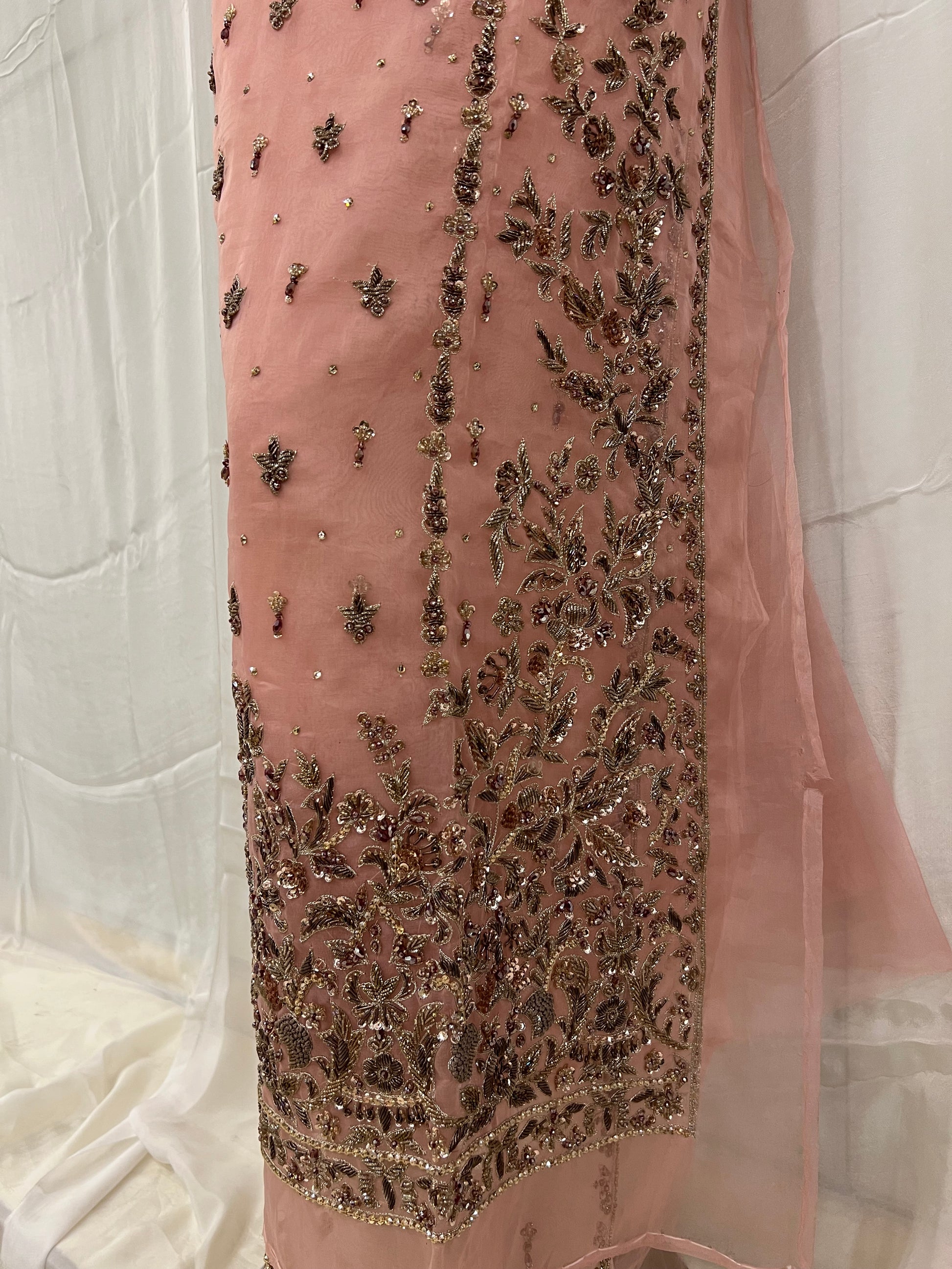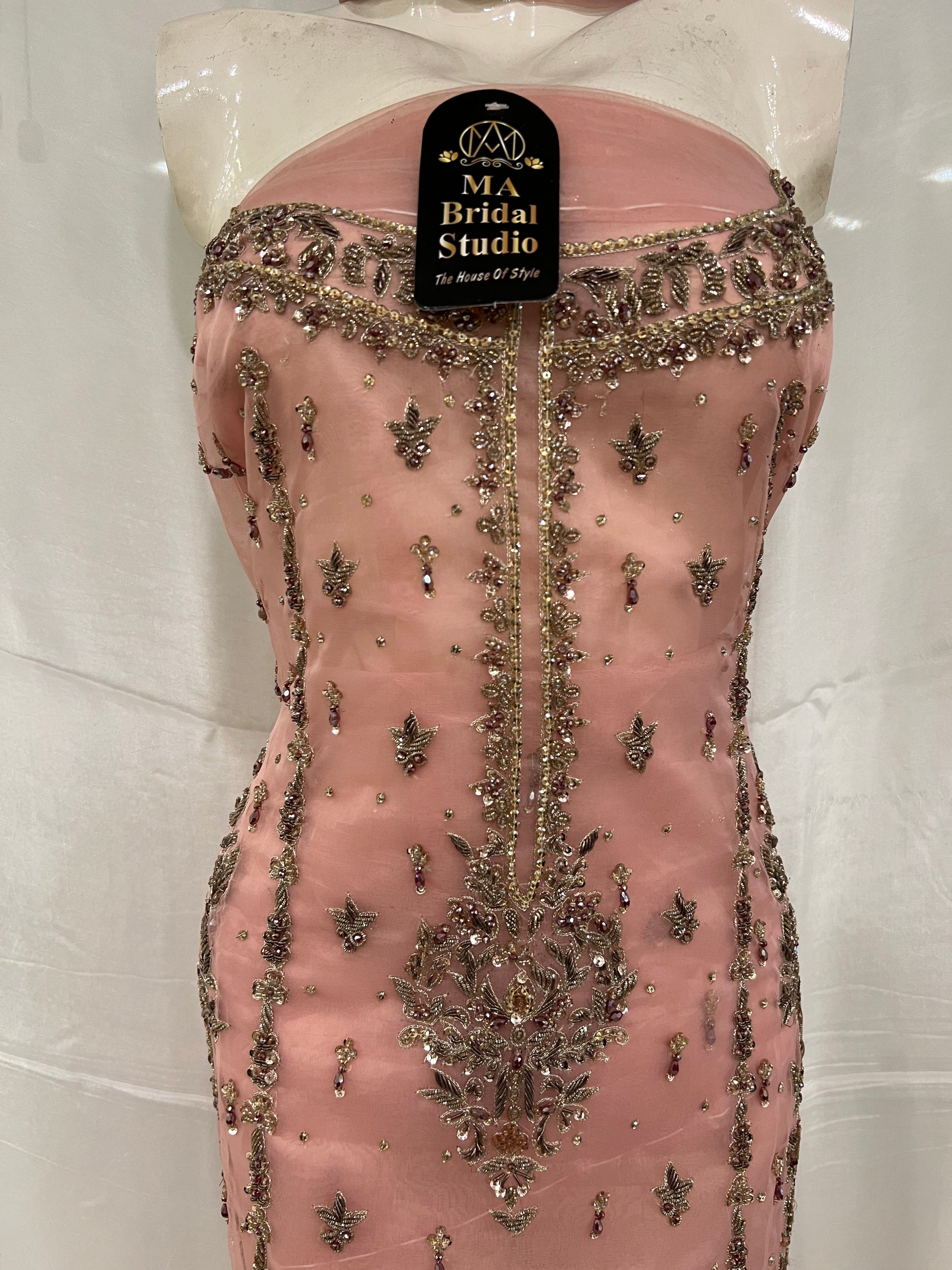 Crafted with soft organza, this luxury antique long-shirt exudes elegance. Adorned with intricate crystals and resham, along with delicate dabka work, it's a timeless piece that adds a touch of vintage charm to any outfit. Experience the ultimate blend of comfort and style with this stunning long-shirt.