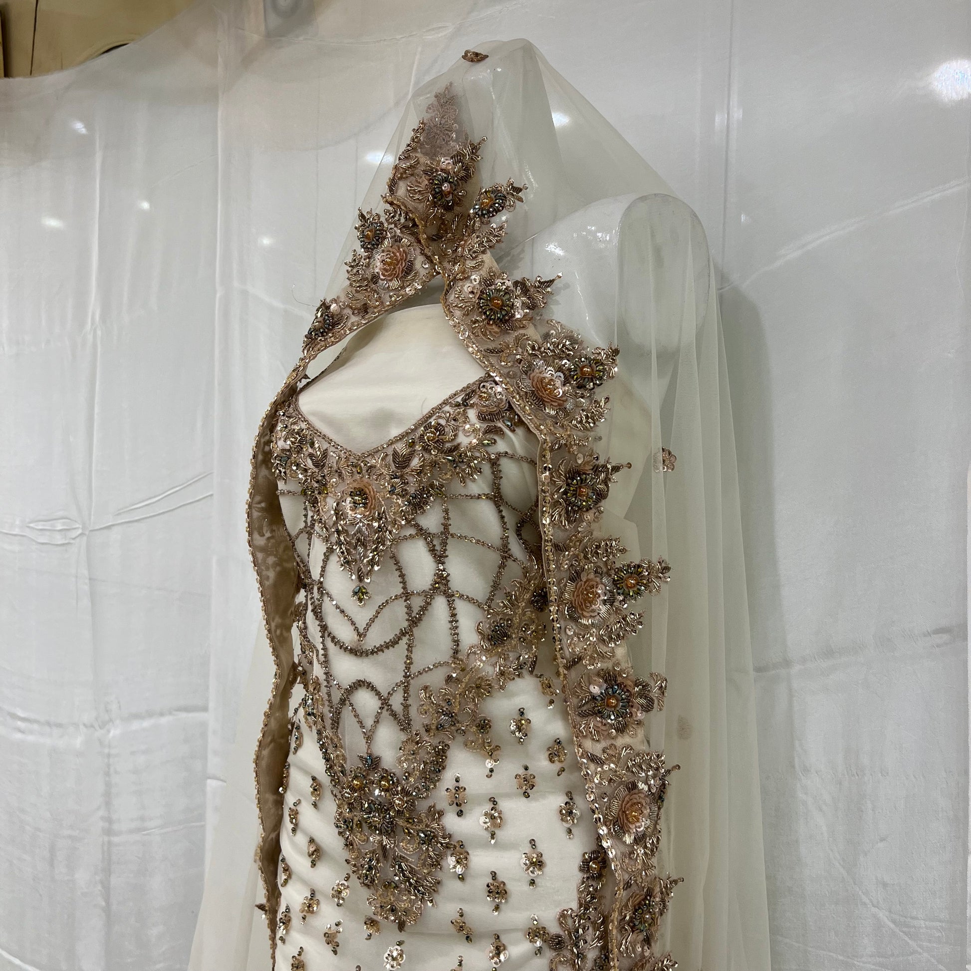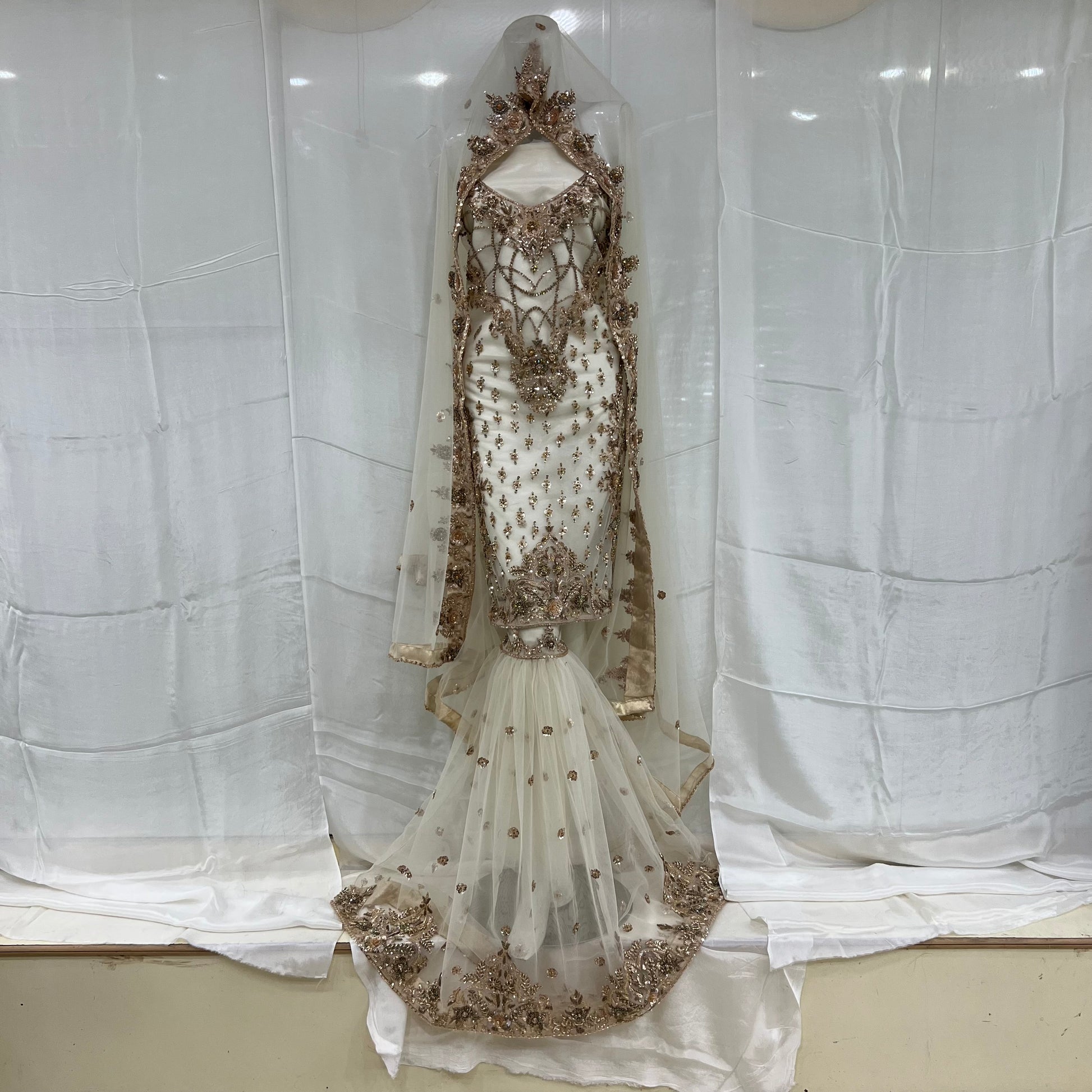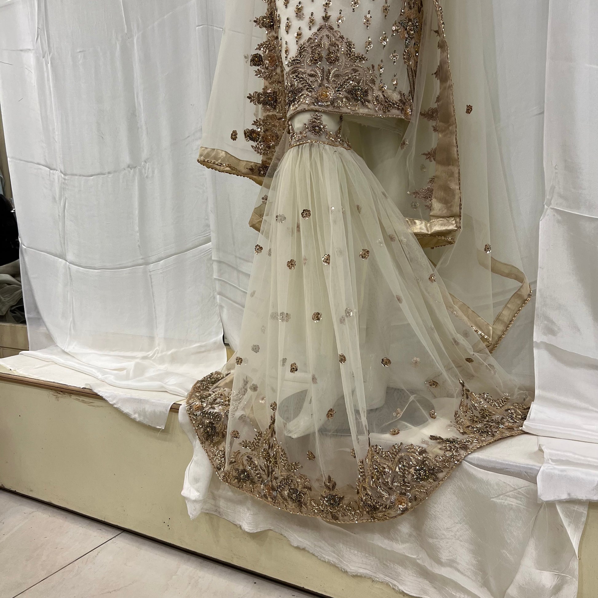 Indulge in luxury and sophistication with our Nikkah Bridal Garara. This off-white ensemble features exquisite zardozi stone and cut dana detailing, creating a timeless and elegant look. Perfect for your special day, this nikkah dress exudes an exclusive and regal charm. Antique touches add an extra layer of glamour to this stunning piece.