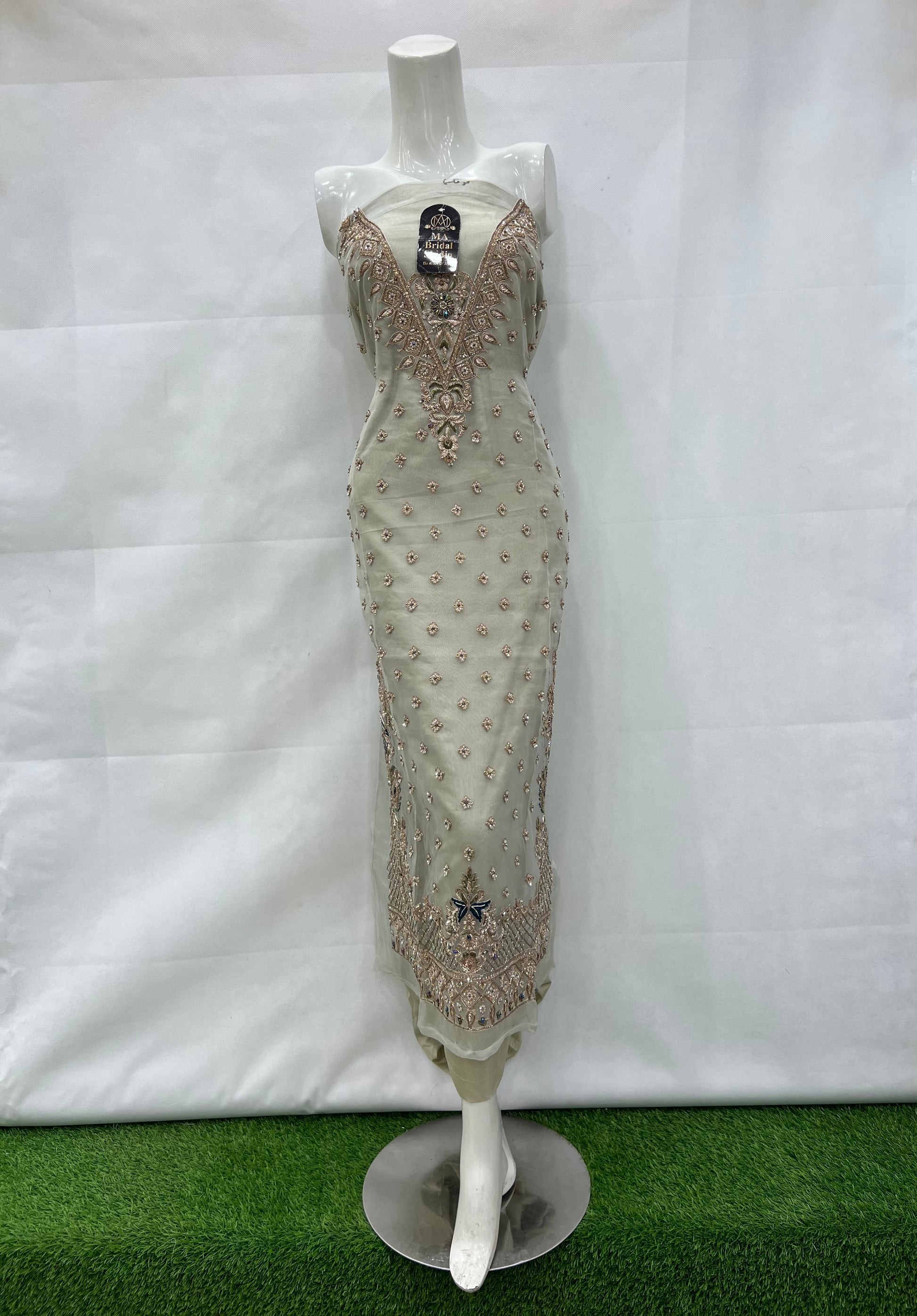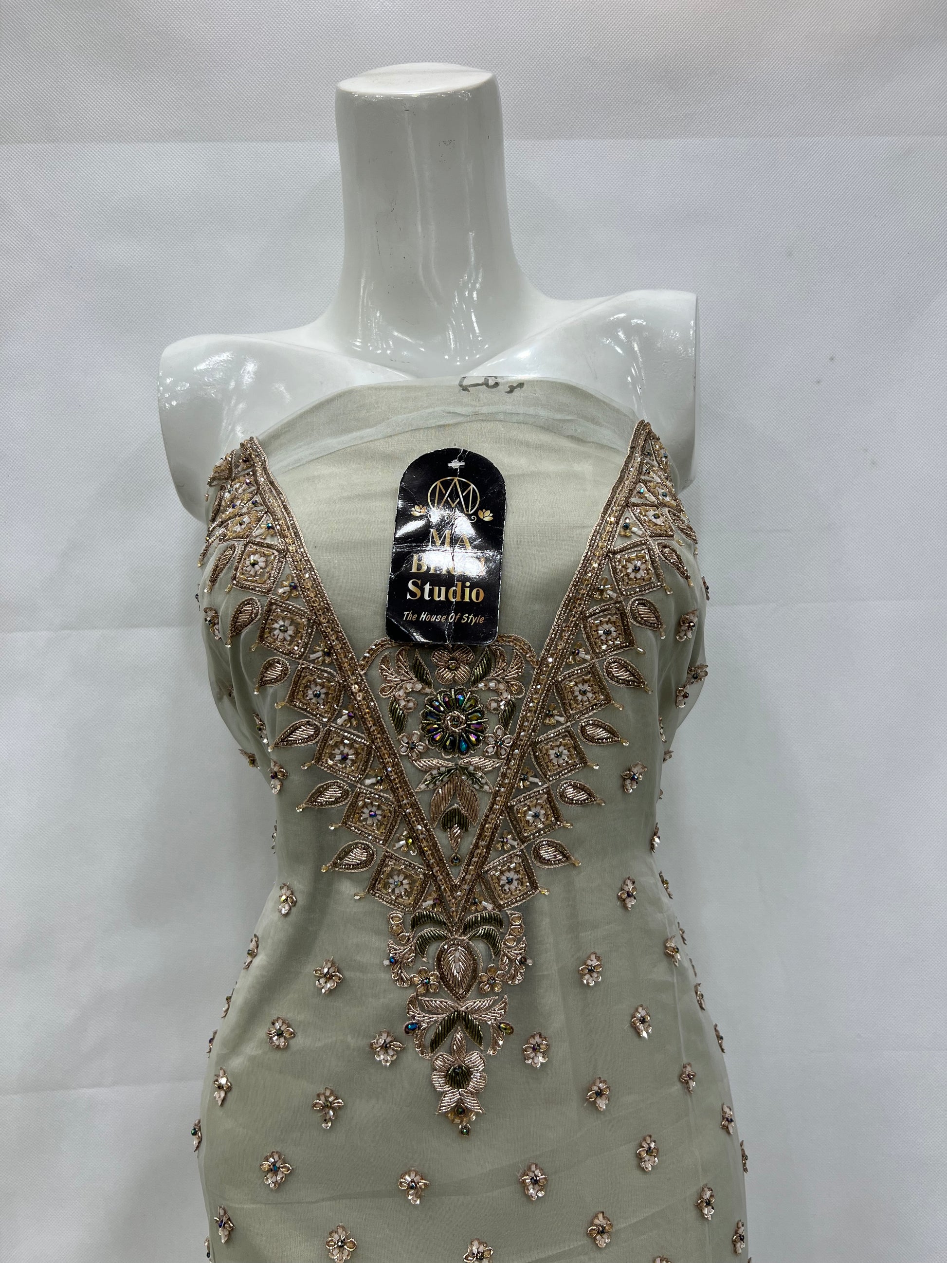 This Organza Gala Daman Chalk Shirt showcases exquisite craftsmanship with delicate naqshi and resham work, enhanced by subtle crystal embellishments. Crafted from lightweight organza fabric, it offers an elegant, airy feel perfect for formal occasions. The chalk-style design pattern adds a refined texture, making this shirt a sophisticated choice for those seeking timeless grace and intricate detailing.
