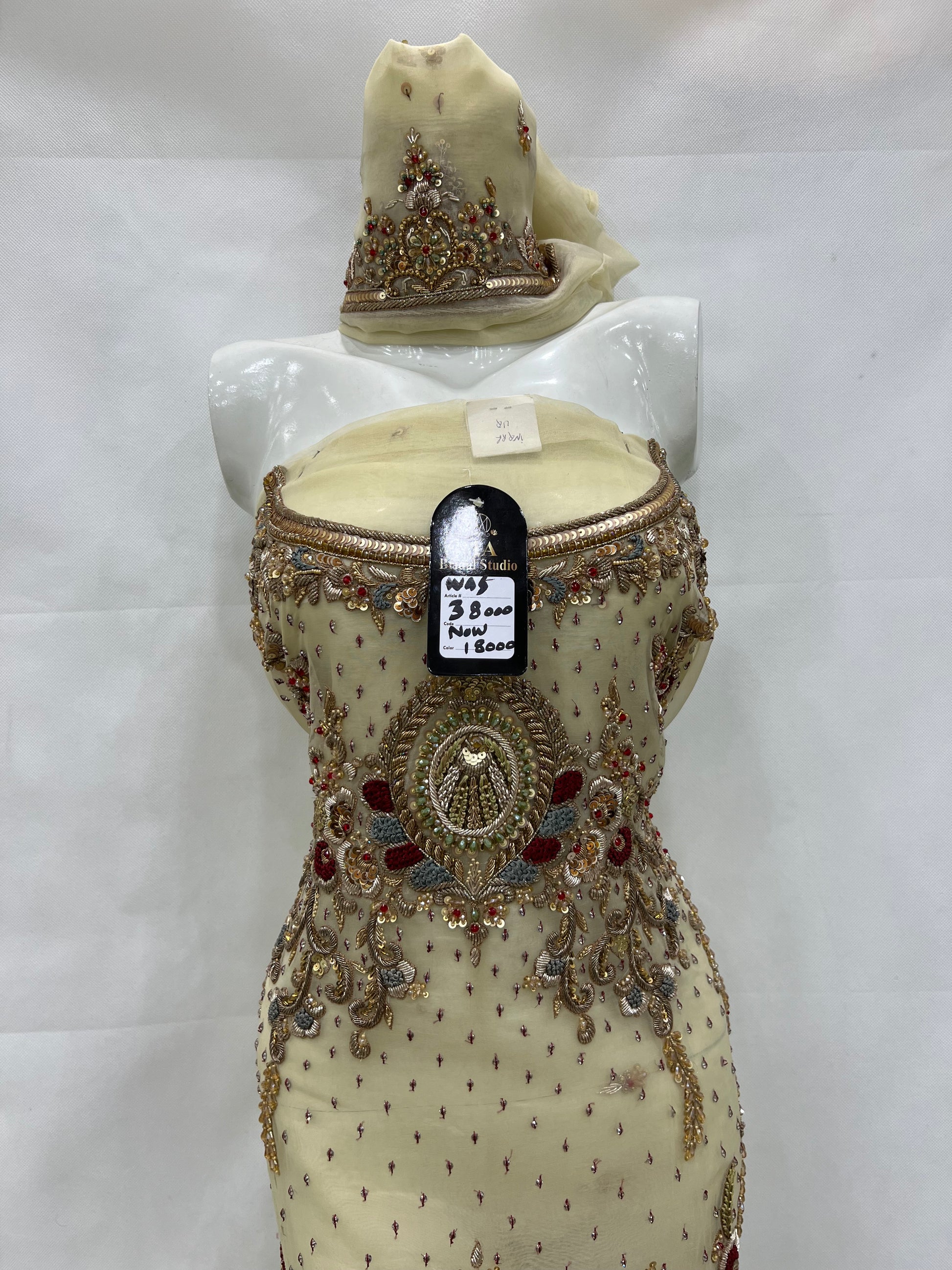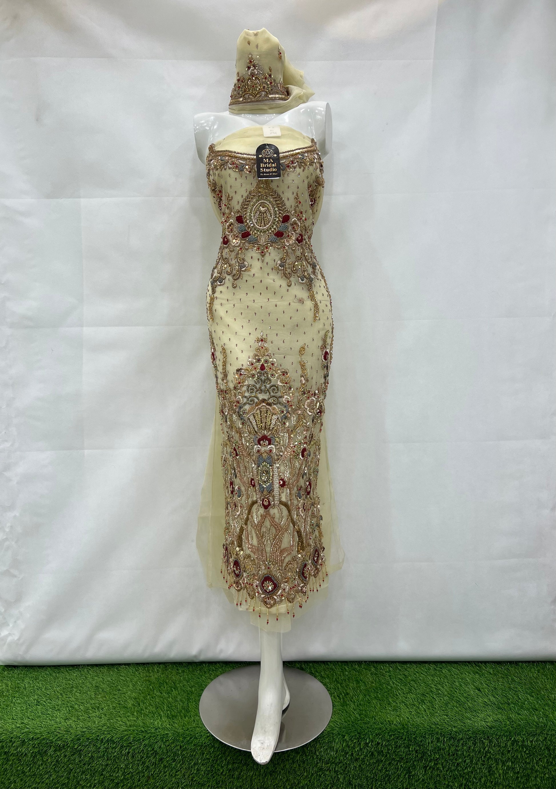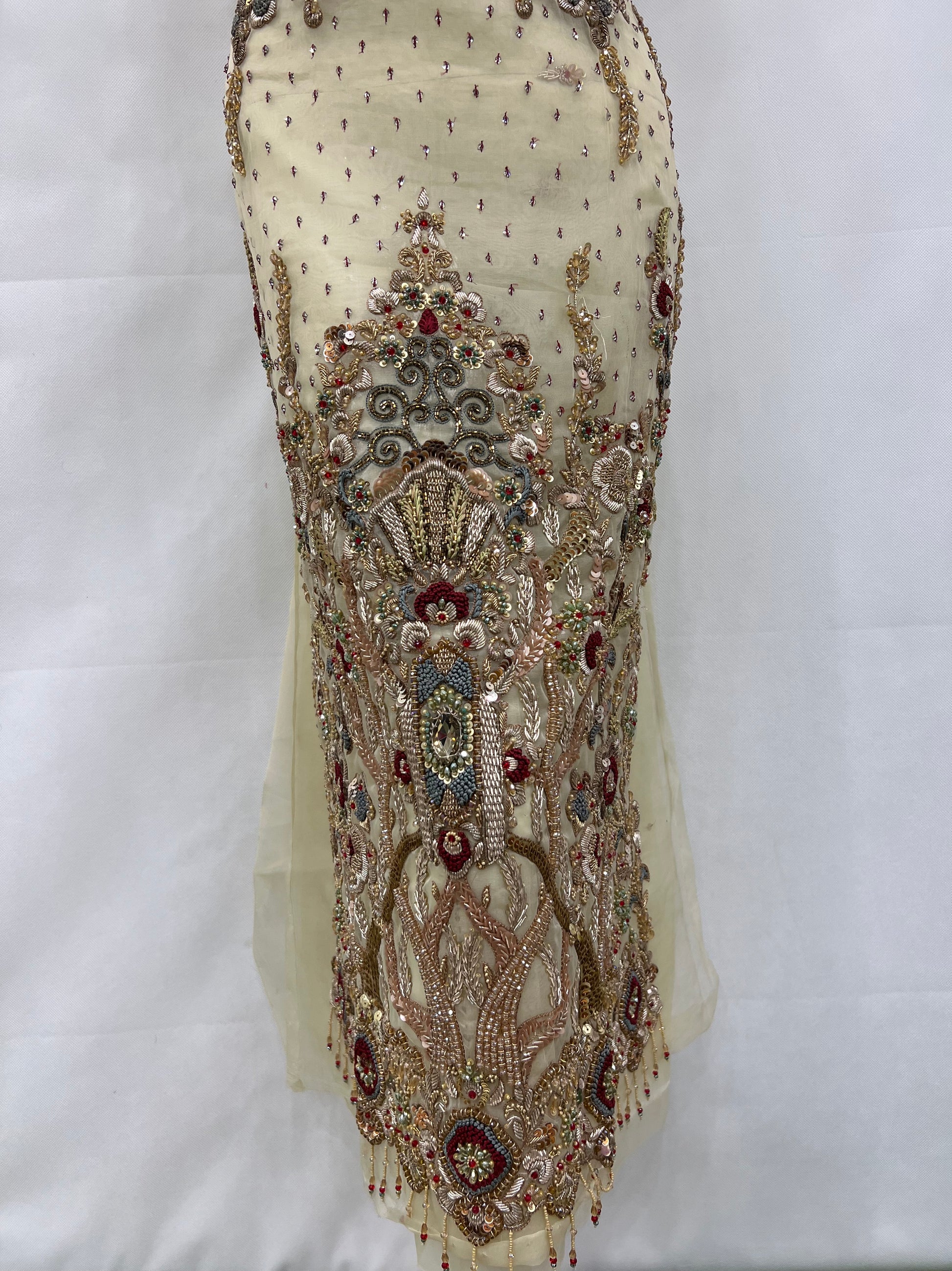This organza shirt features a heavy daman adorned with intricate multi-work, including naqshi and resham embroidery enhanced by sparkling crystals. Its unique design pattern adds elegance and sophistication, making it a standout piece for special occasions. Crafted to offer both style and comfort, this shirt is perfect for those seeking a refined and graceful look.