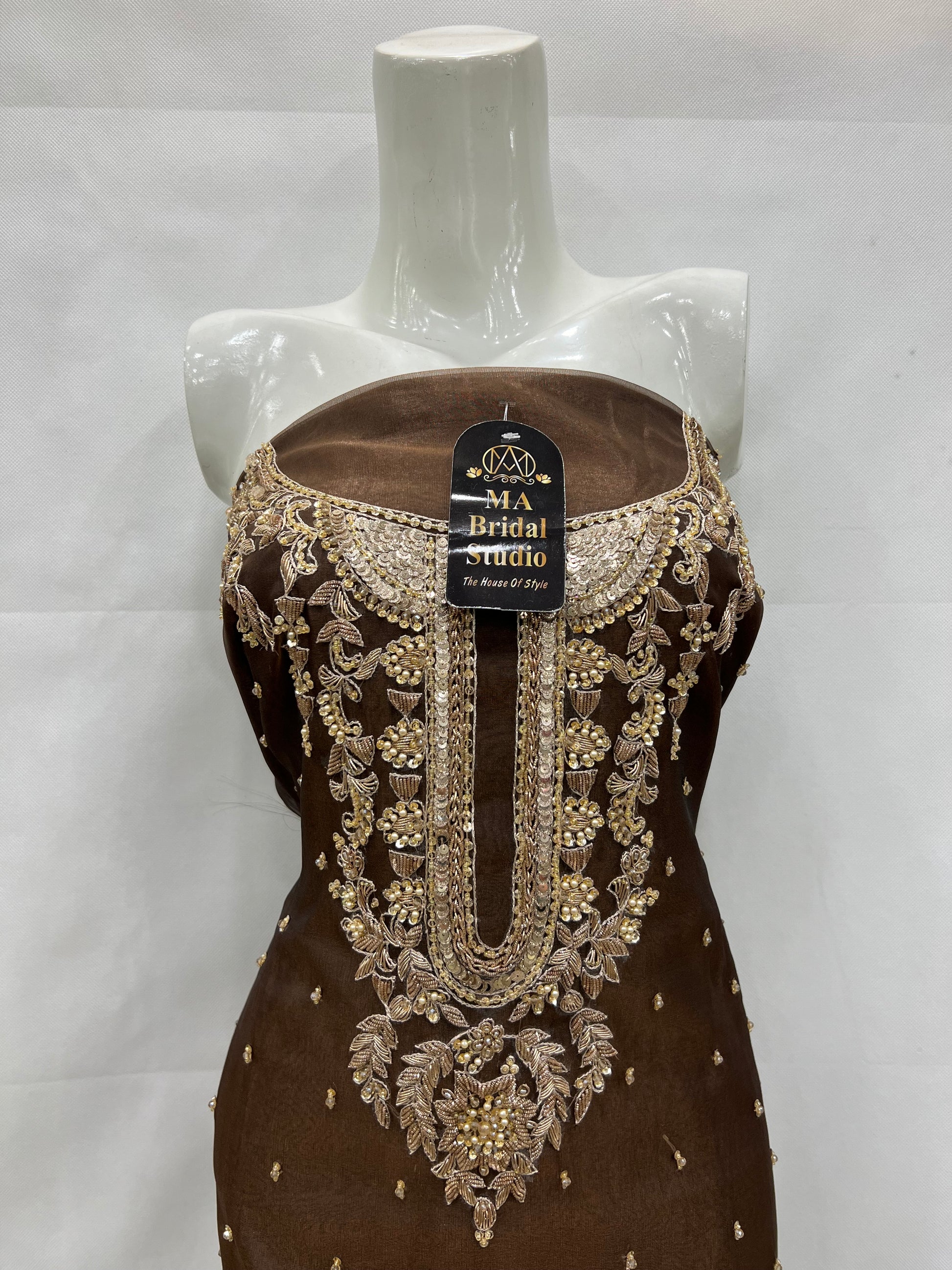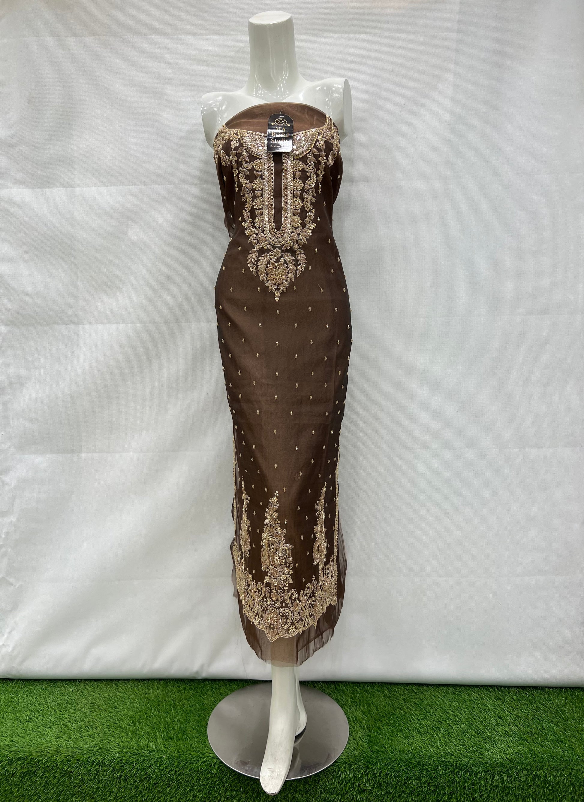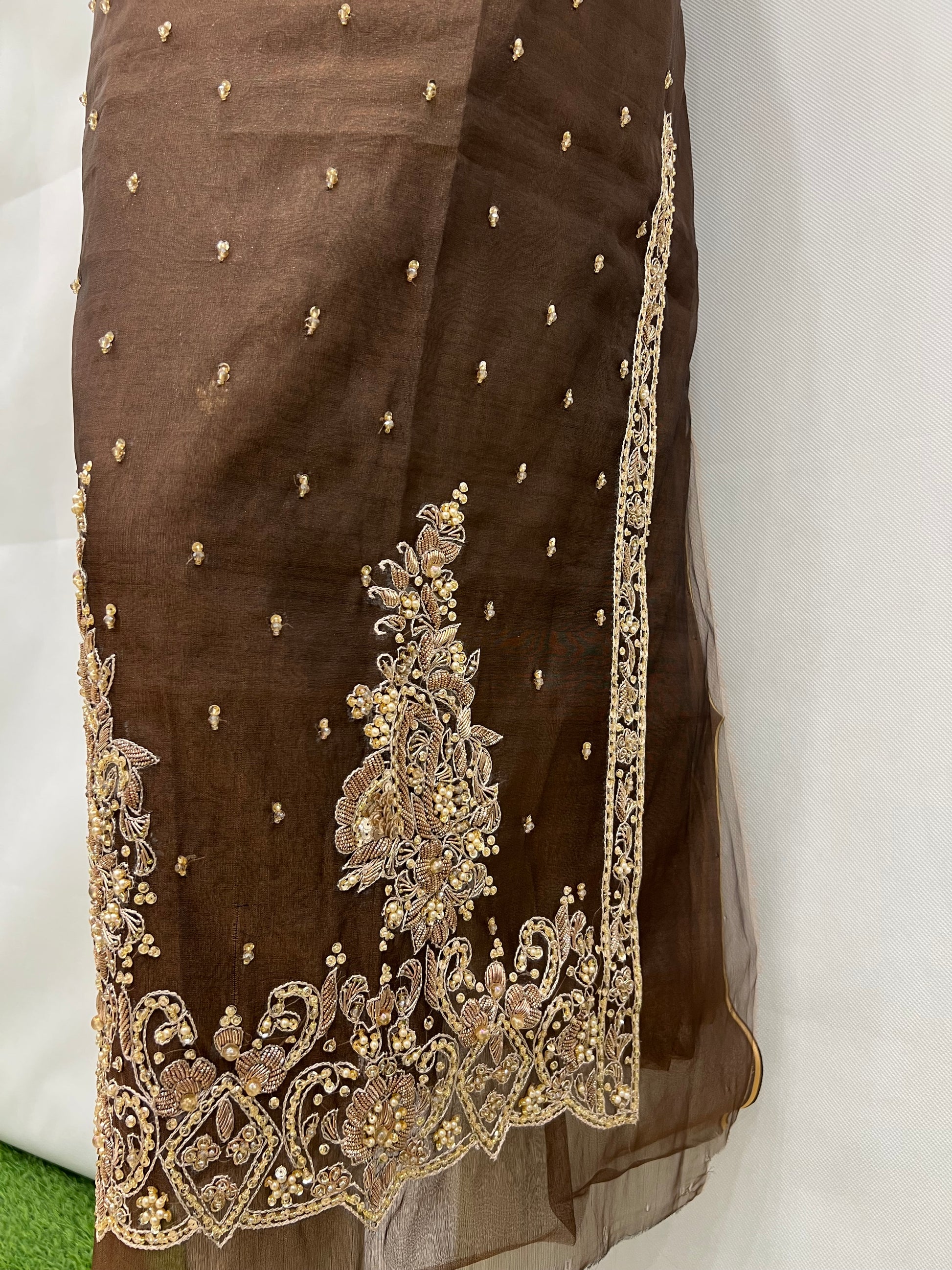 This organza long shirt showcases a beautiful double shade of brown, enhanced by elegant chalk-style motifs along the border. Crafted from lightweight organza fabric, it offers both comfort and sophistication, making it an ideal choice for adding a graceful touch to your wardrobe.
