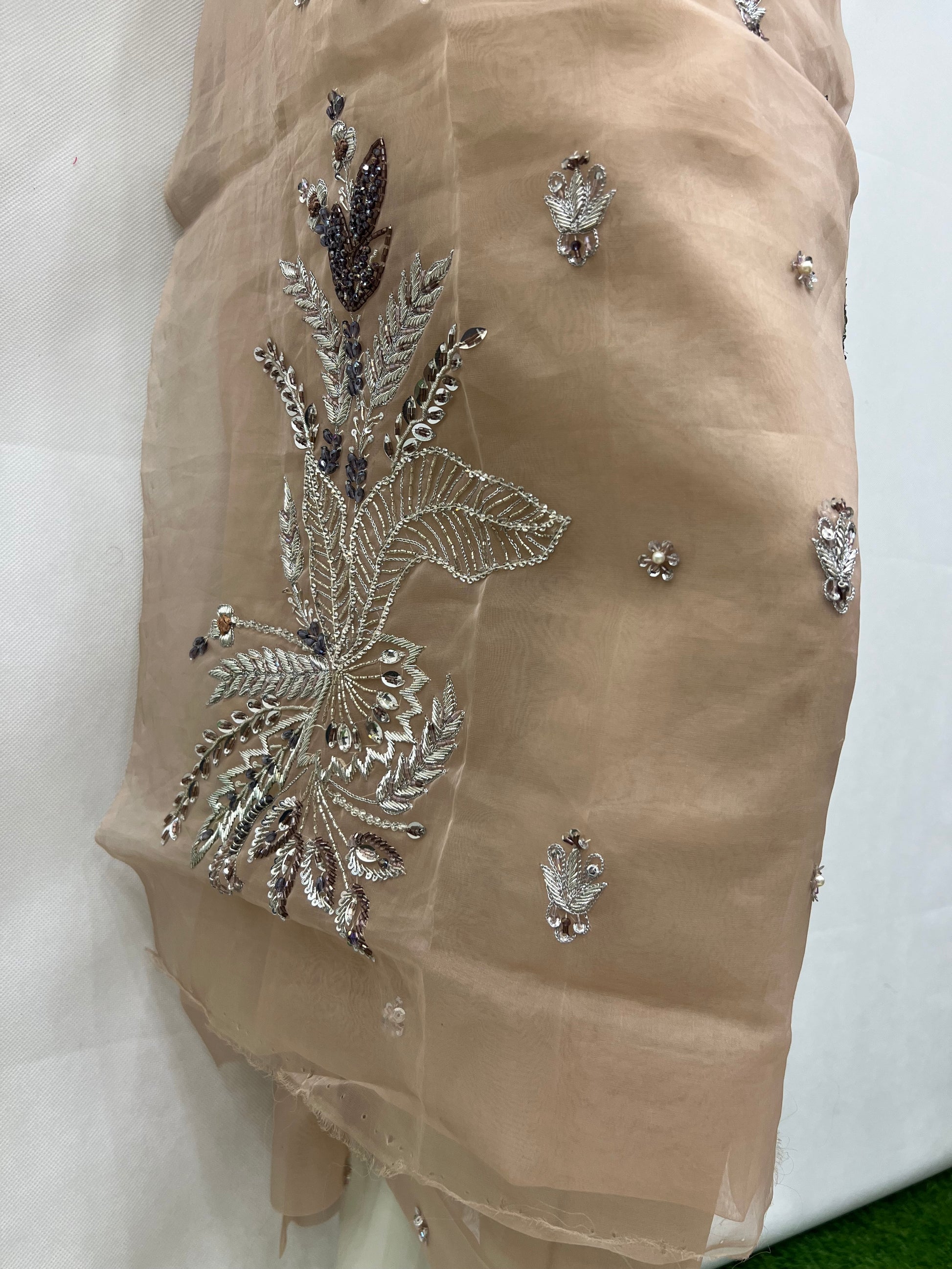 This organza motive style shirt features delicate craftsmanship with intricate motive designs enhanced by fine cutdana work. The lightweight organza fabric offers an elegant, sheer texture, making it perfect for sophisticated occasions. Expertly crafted, this shirt combines traditional artistry with contemporary style for a refined and graceful look.