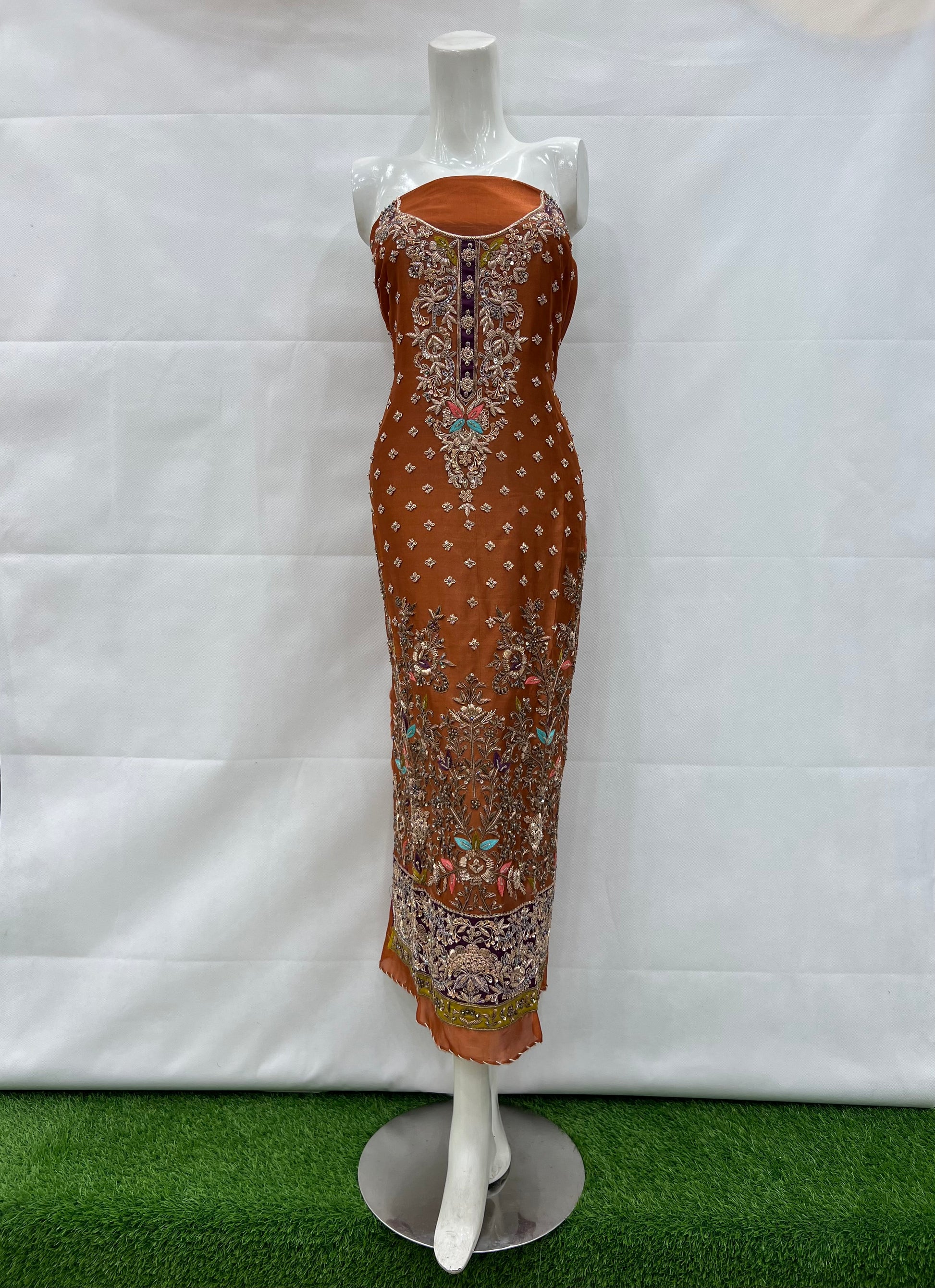This elegant long shirt in a rich mustard tone is crafted from premium silk fabric and features intricate appliqué, antique dabka, and resham embroidery. The heavy daman detailing adds a touch of timeless sophistication, making it an exquisite choice for refined occasions.
