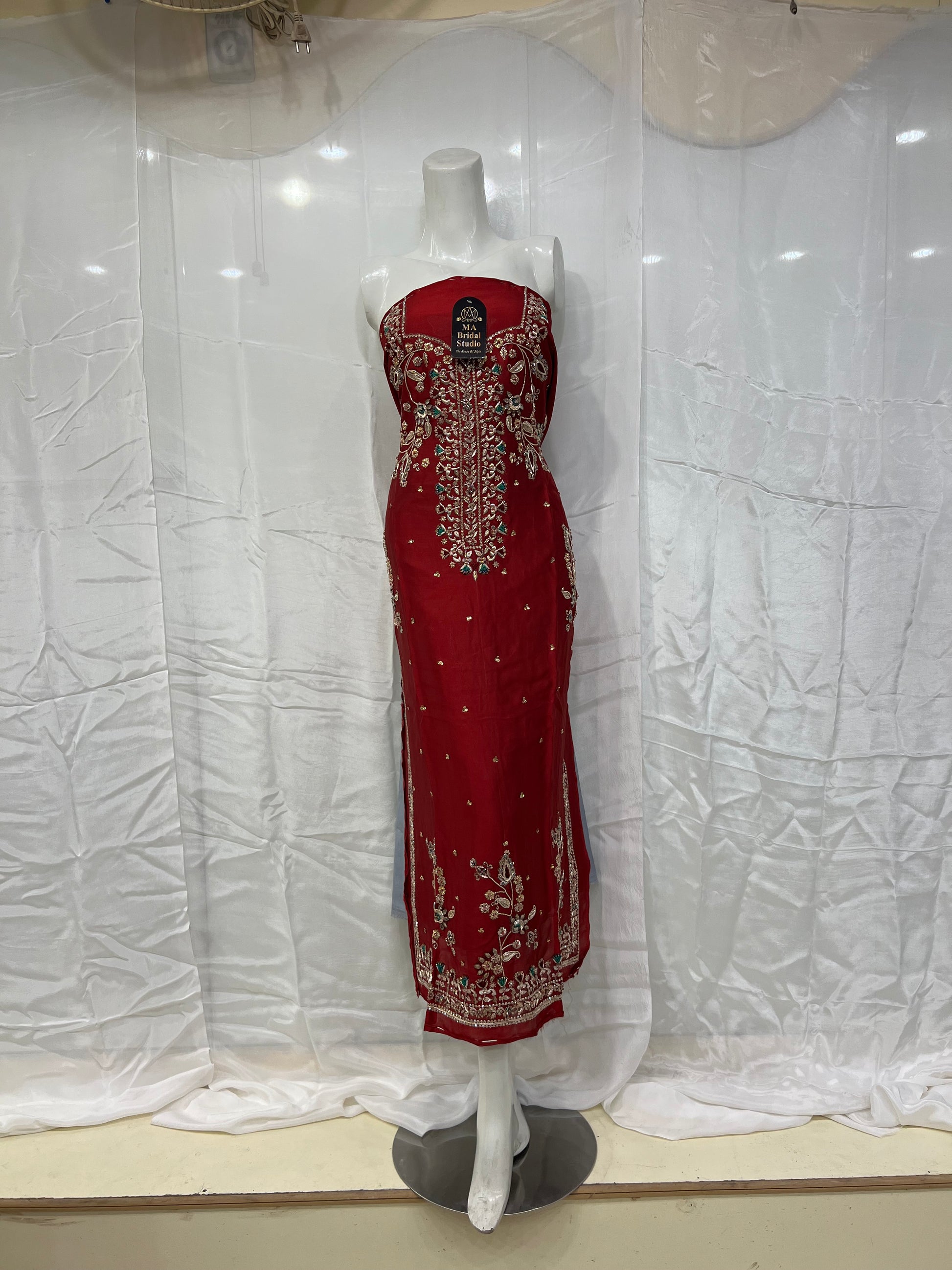 This elegant long shirt is crafted from luxurious Shehsa silk in a striking red hue, featuring delicate chalk-style kachay-ka-kaam. Its refined design combines traditional craftsmanship with contemporary sophistication, making it a perfect choice for special occasions where timeless elegance is desired.