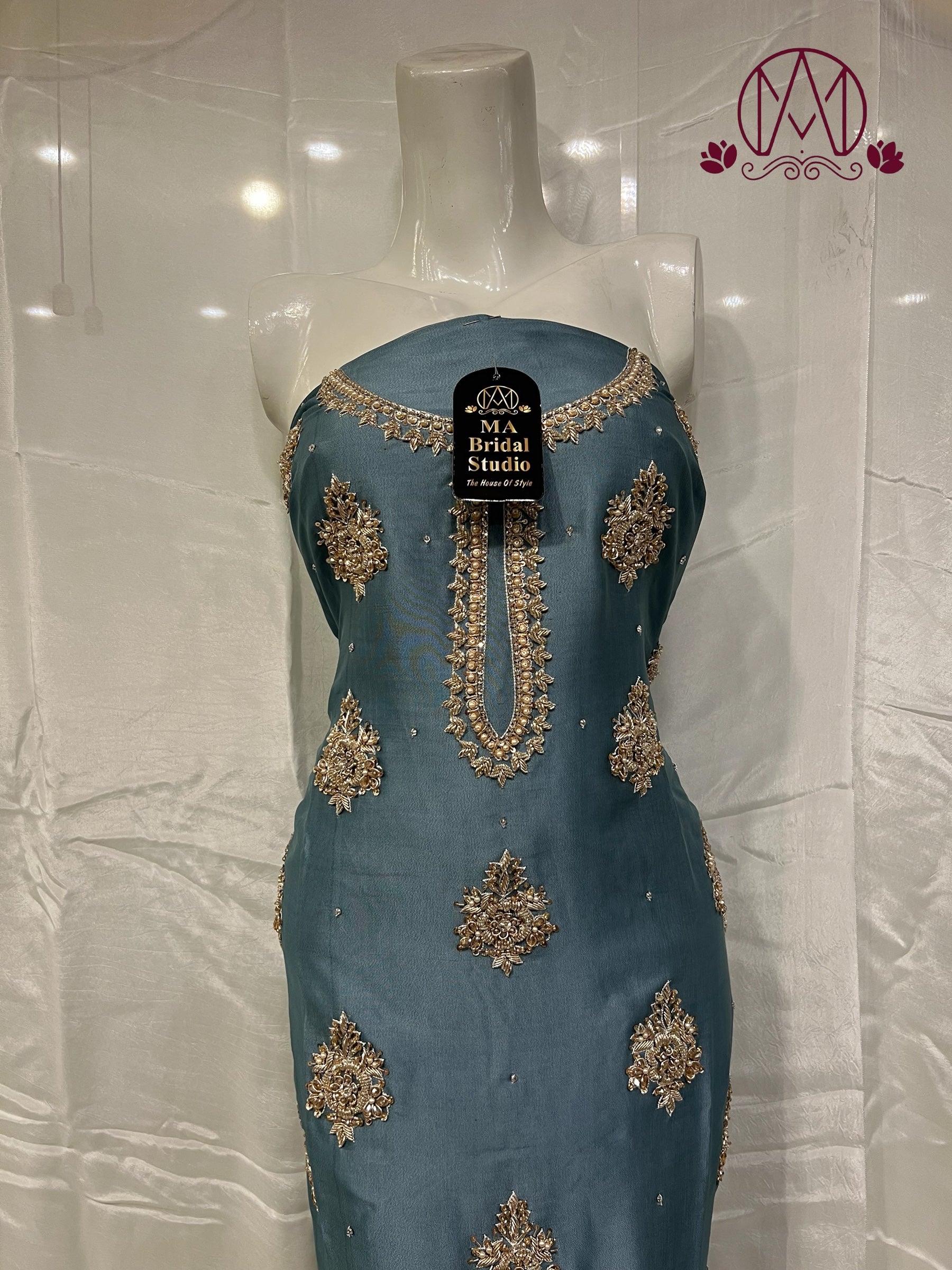Experience elegance with this long shirt crafted from luxurious shesha silk. Featuring intricate multi-appliqué work on the daman, it adds a refined touch to your wardrobe. Perfect for special occasions, this shirt combines comfort with stunning detail to make you stand out effortlessly.