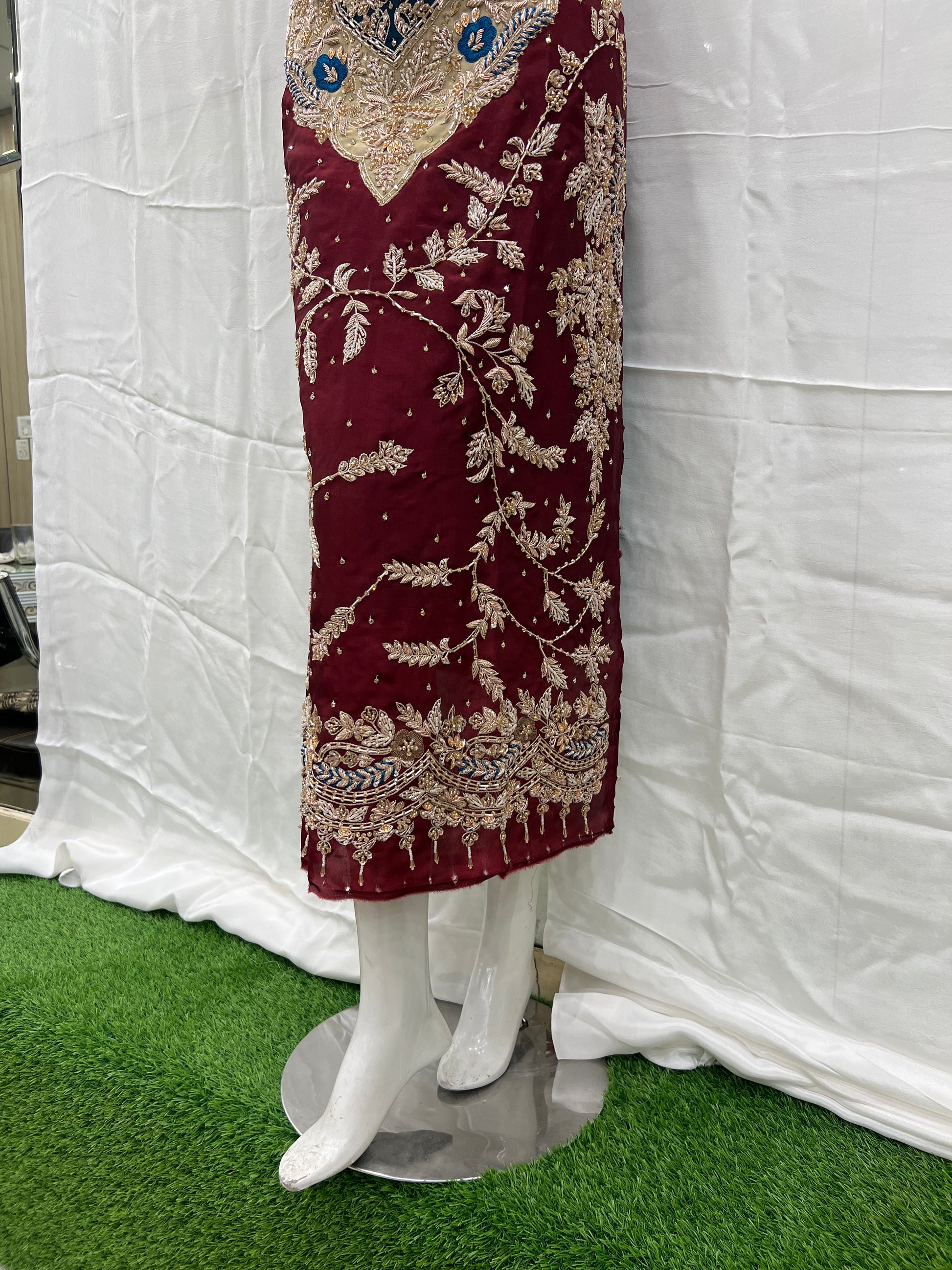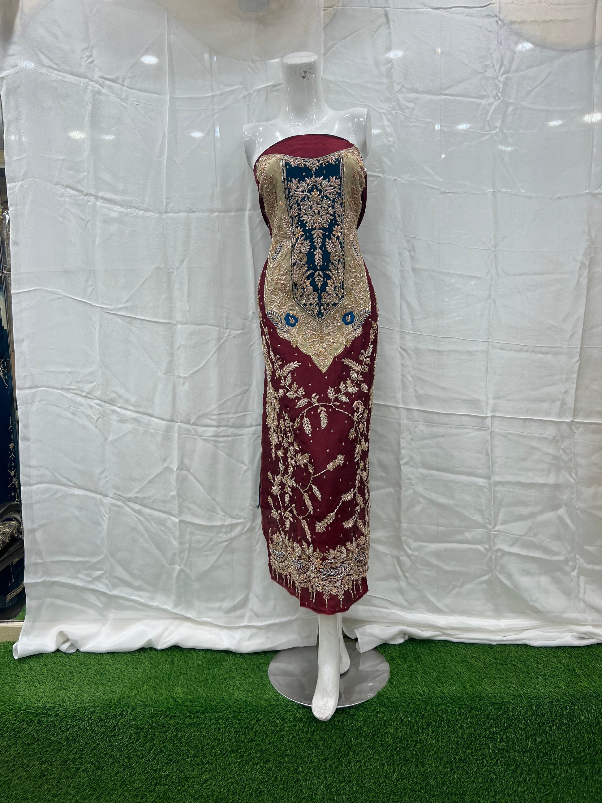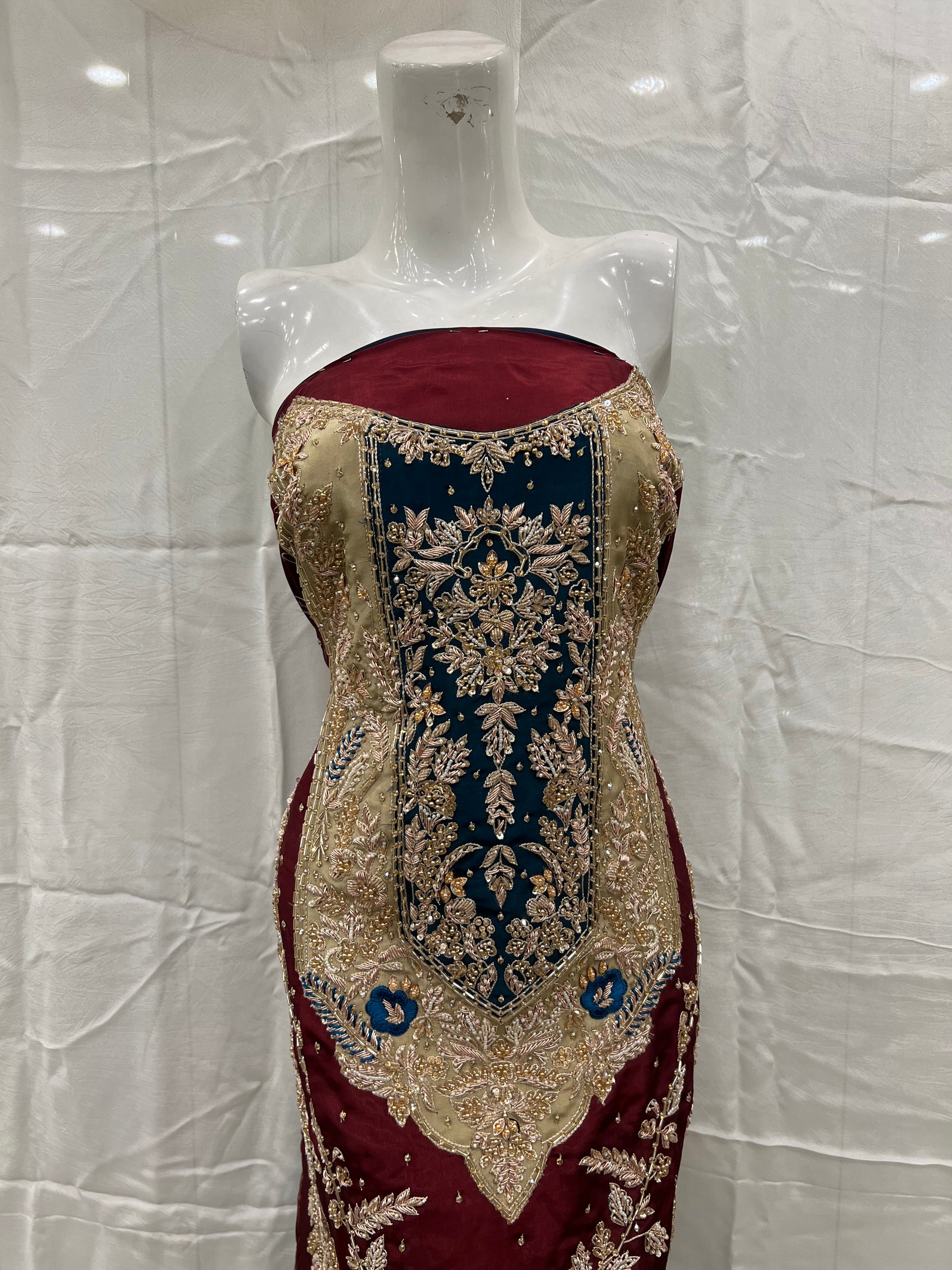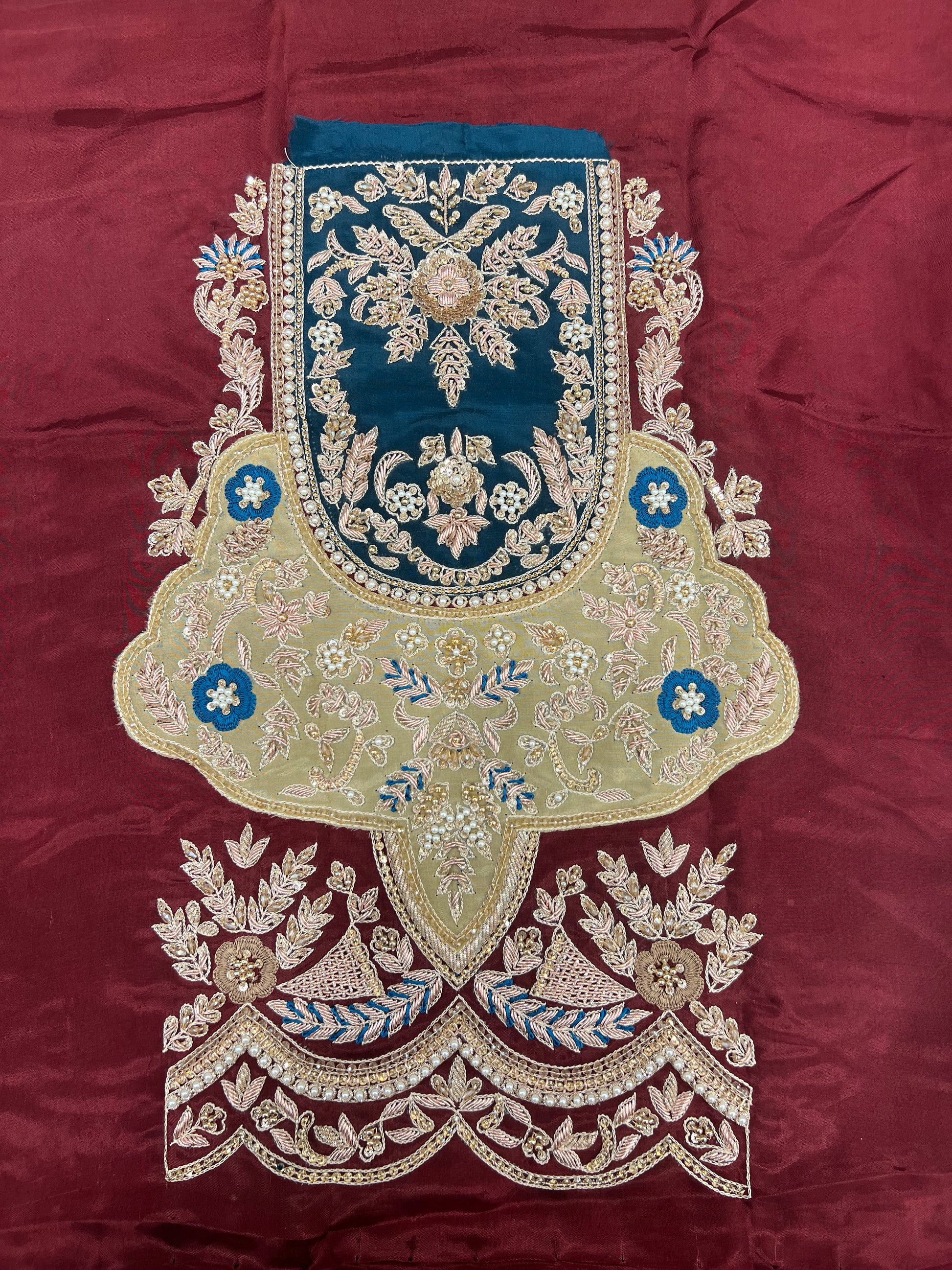 This maroon Silk gla patch long shirt exemplifies superior craftsmanship through its detailed embellishments on full sleeves. The premium silk construction offers exceptional drape and texture, while the strategic gla patch detailing enhances the silhouette. The extended length provides versatile styling options, making this designer piece suitable for both formal occasions and elevated everyday wear.