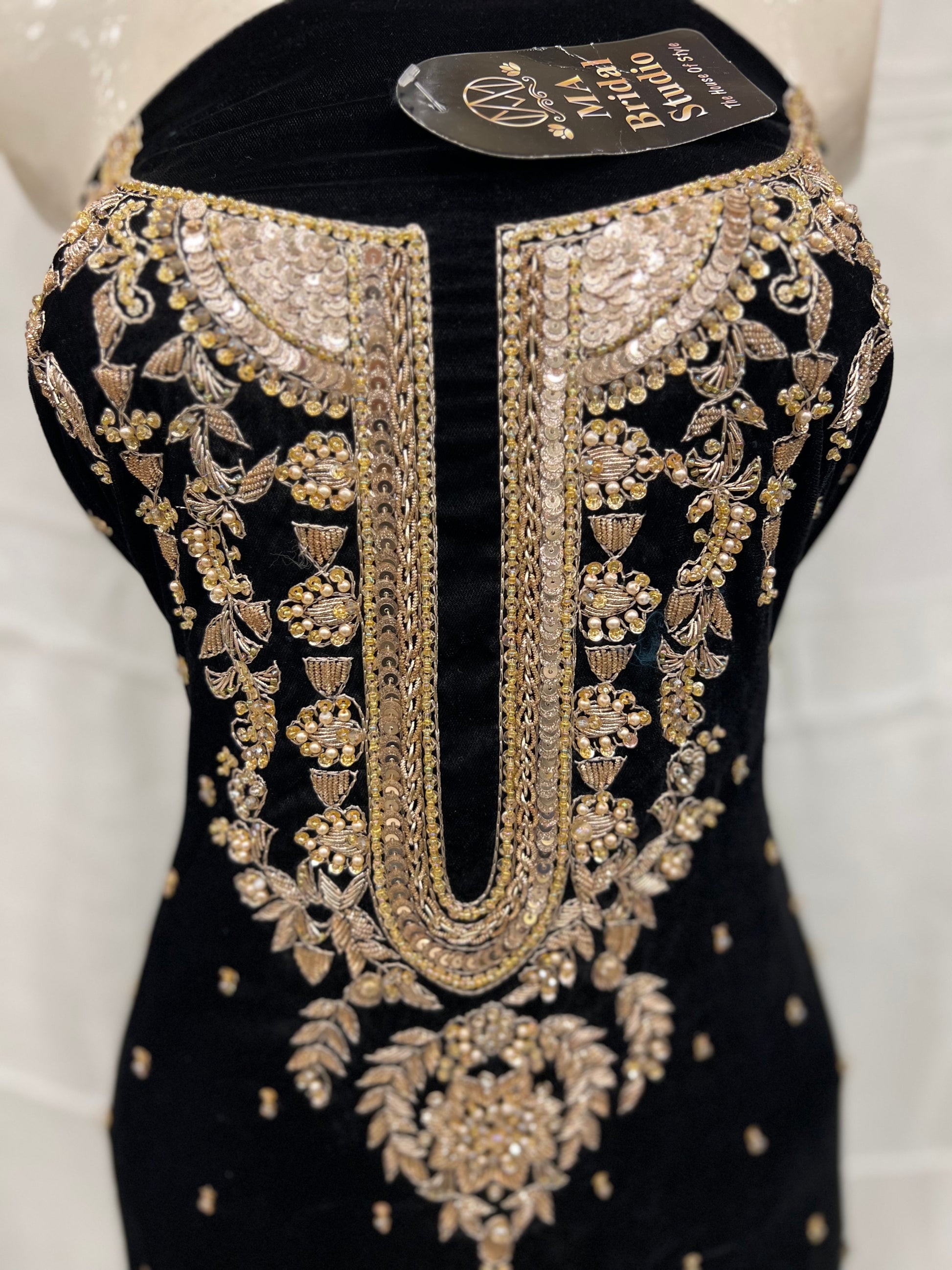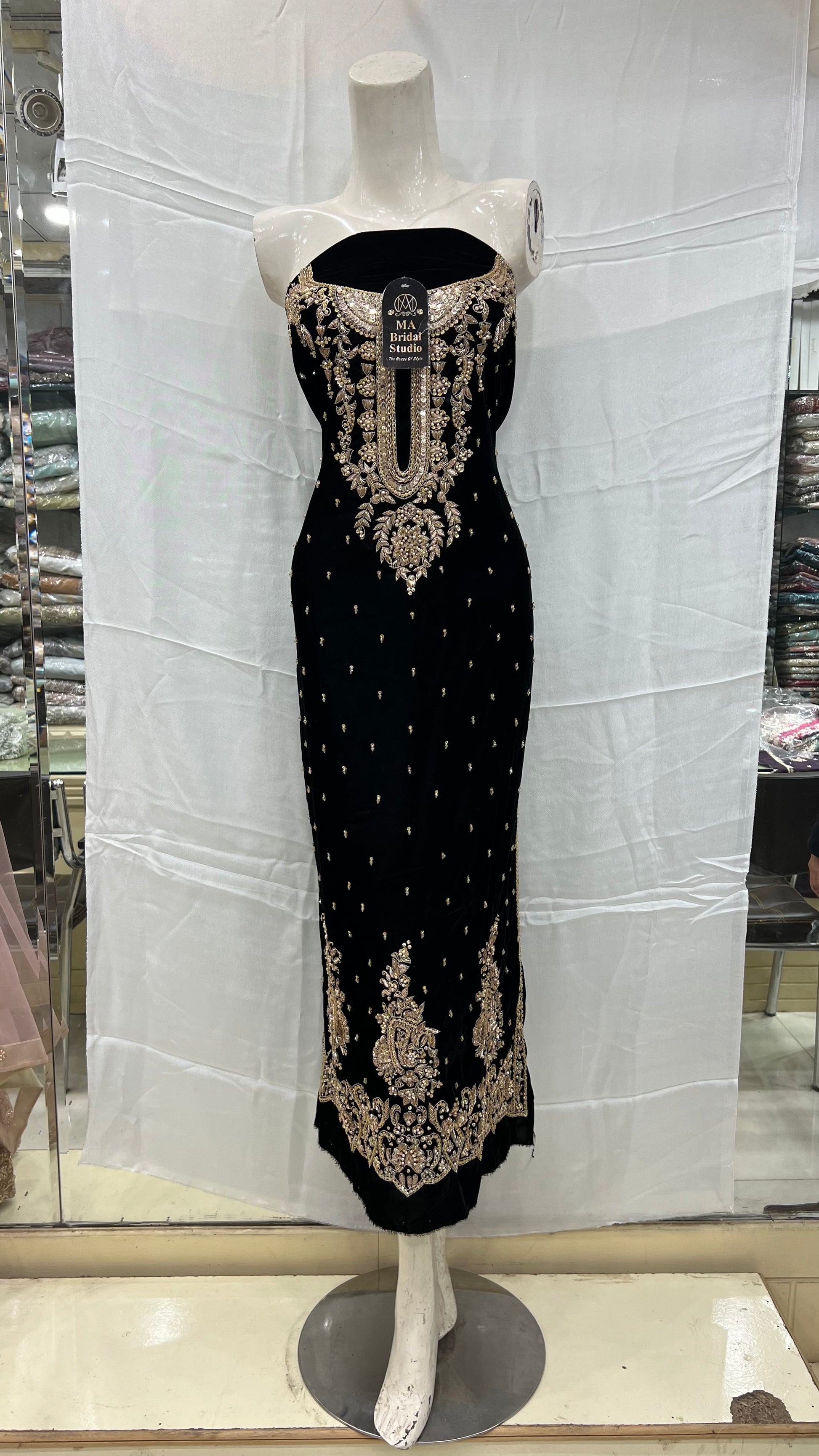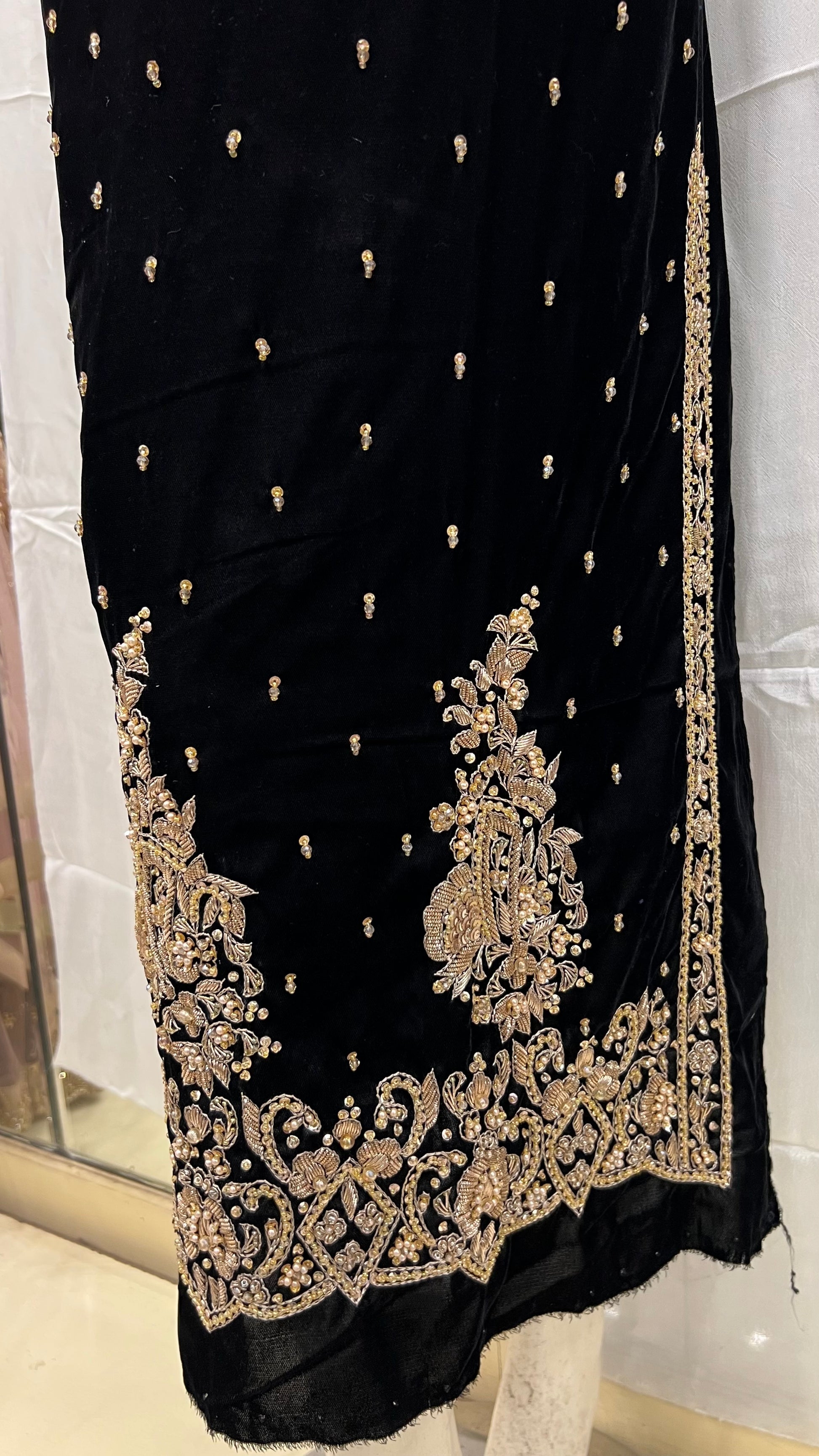 Conquer the day in this hand made black velvet long shirt adorned with crystals, sequence, jewelry stones, and pearls. Unleash the bold adventurer in you with this daring and luxurious piece. Perfect for those who love to take risks and stand out from the crowd.