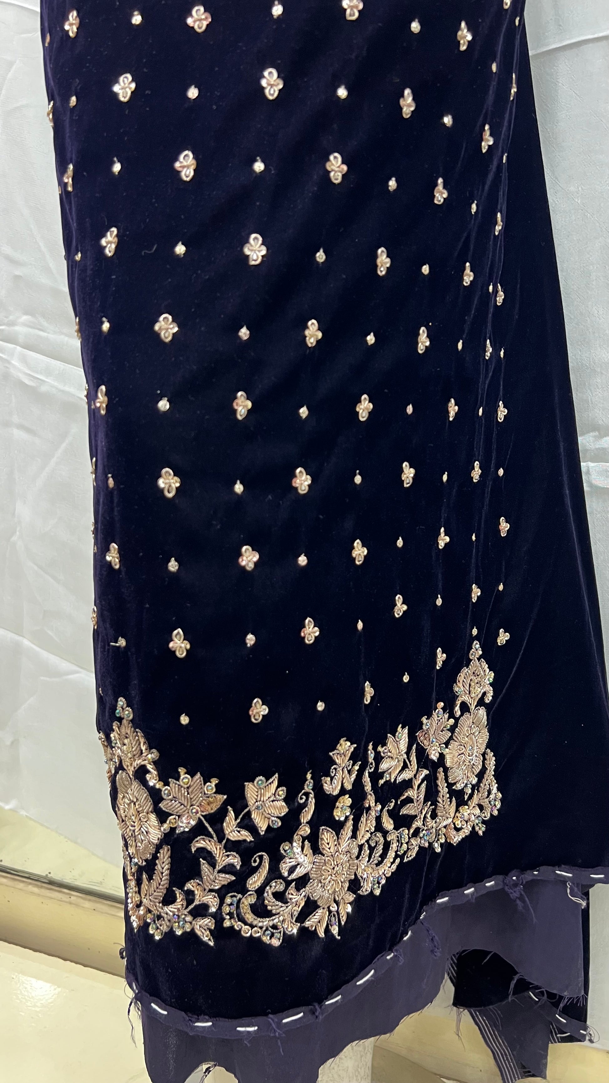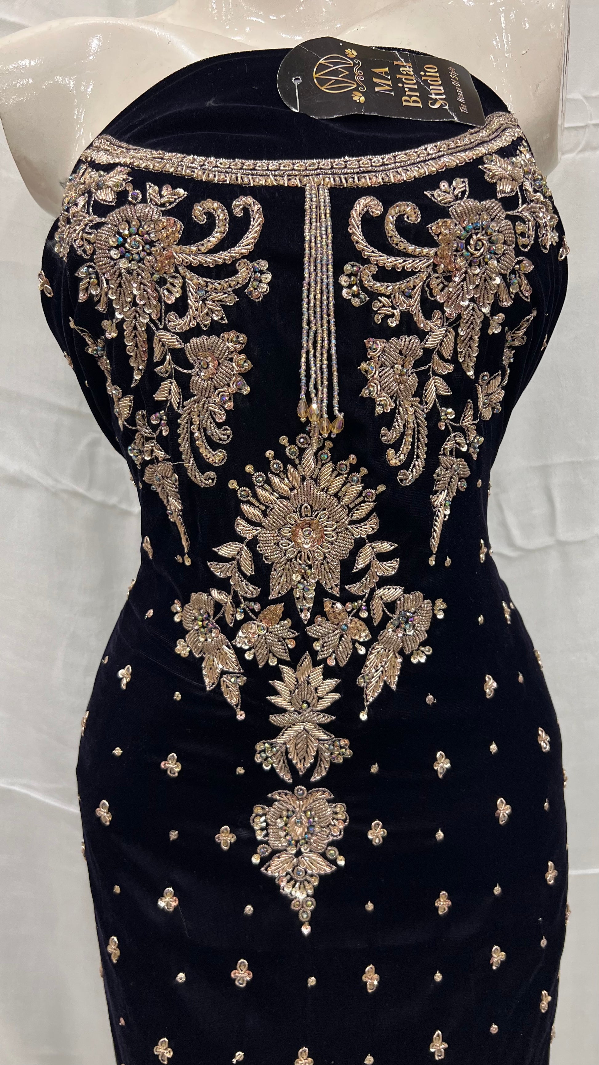 Get ready to dazzle in this formal velvet shirt, hand embellished with delicate crystals and traditional dabka, sequence, zardozi stone and cut dana. Perfect for any special occasion, this long shirt will have you feeling luxurious and stylish all night long.